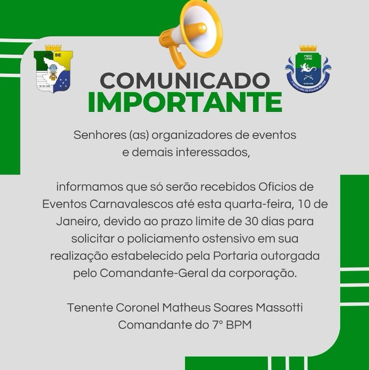 Por meio de suas redes sociais, o 7º Batalhão de Polícia Militar (7ºBPM) informou que o prazo para o recebimento de ofícios para segurança em eventos carnavalescos devem ser apresentados até esta quarta-feira, 10 de janeiro.