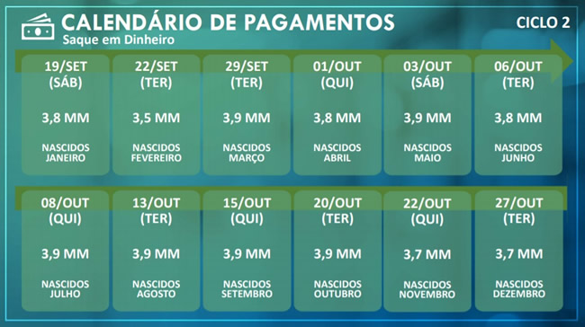 Já para os beneficiários que nasceram entre janeiro e outubro, está liberado o saque das últimas parcelas do Ciclo 2 de pagamentos, ou seja, para quem recebeu até a quinta parcela do auxílio.