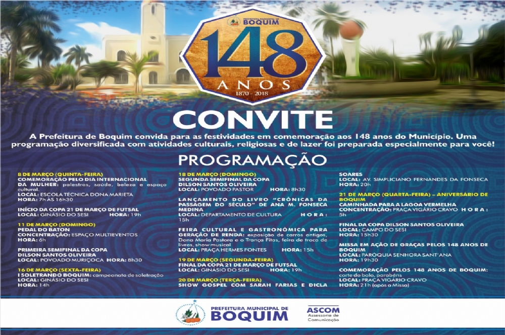 Para comemorar o aniversário do município, a Prefeitura de Boquim preparou uma programação diversificada, com atividades culturais, religiosas, esportivas e de lazer voltadas para toda a família, que acontecerá do dia 8 a 21 de março.