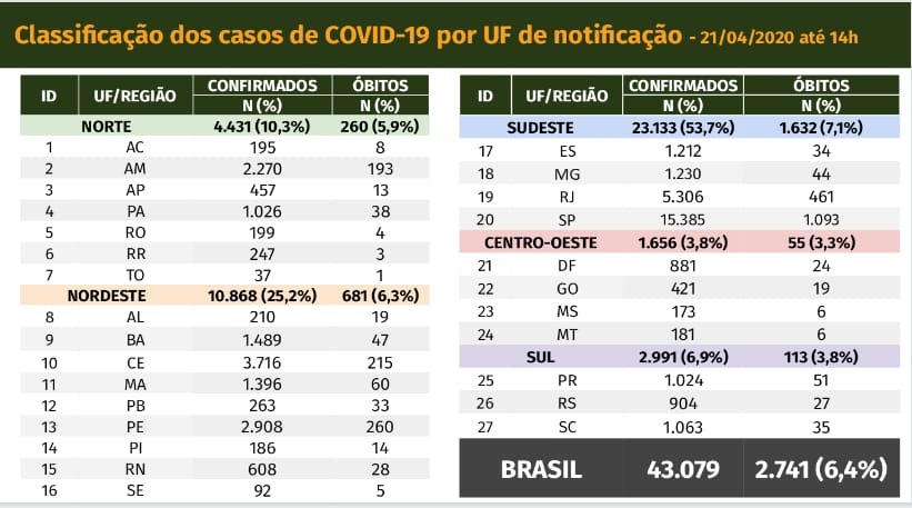 O Ministério da Saúde divulgou, na última terça-feira, 21, novos números sobre a pandemia do novo coronavírus (covid-19) no país. De acordo com levantamento diário feito pela pasta, o Brasil tem 43.079 casos confirmados da doença e 2.741 mortes foram registradas. A taxa de letalidade está em 6,4%. Nas últimas 24 horas, o ministério registrou 2.498 novos casos e 166 mortes.
