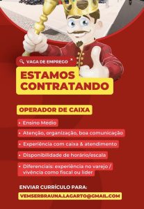 O Braúna Lagarto, rei dos preços baixos, anunciou que estão abertas novas vagas de emprego.