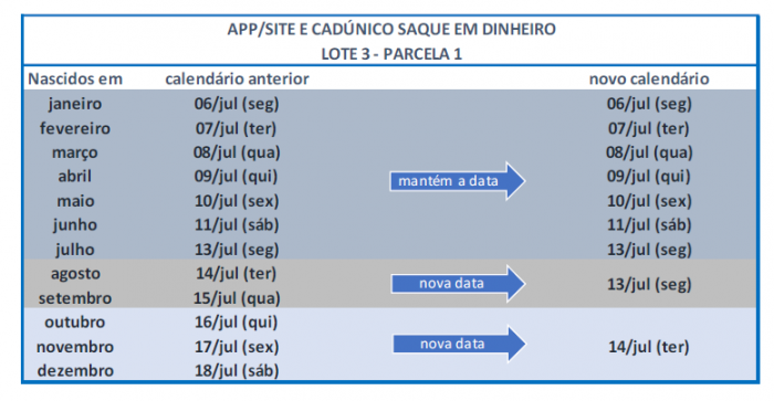 O calendário de saque em dinheiro teve início no dia 6 de julho, também de forma escalonada pelo mês de nascimento. No entanto, uma previsão inicial era de que ele chegasse ao dia 18 de julho, quando os nascidos em dezembro permitiriam sacar.