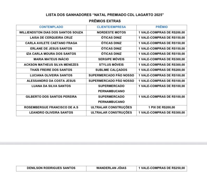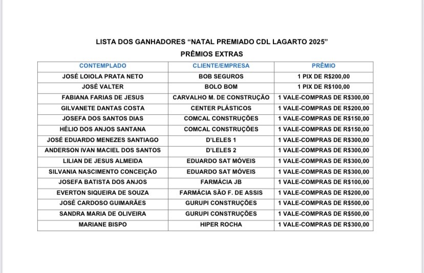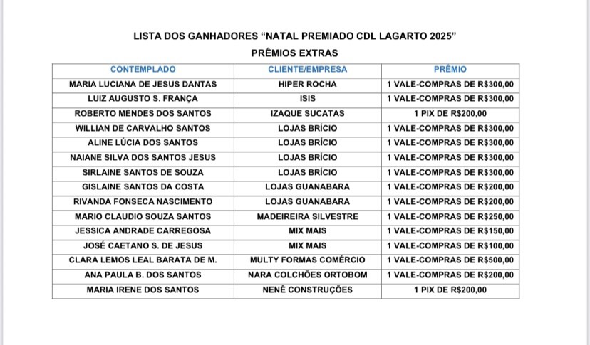 A Câmara dos Dirigentes Lojistas de Lagarto (CDL) divulgou a lista dos sorteados nos prêmios extras do Natal Premiado 2025.