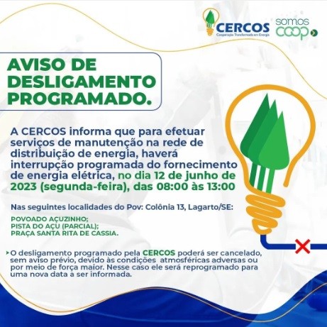 No próximo dia 12 de junho, das 08h às 13h, a Cooperativa de Eletrificação e Desenvolvimento Rural Centro Sul de Sergipe (CERCOS) realizará o desligamento programado nos povoados Açuzinho, Pista do Açu (Parcial), e na Praça Santa Rita de Cássia. Todas as localidades estão situadas na região do povoado Colônia 13, zona rural de Lagarto.