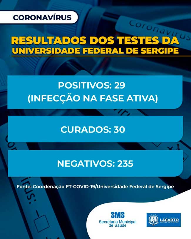 Nesta segunda-feira, 18, a Secretaria Municipal de Saúde (SMS) de Lagarto divulgou os resultados dos testes realizados pela Universidade Federal de Sergipe (UFS), no dia 7 deste mês, com o objetivo de mapear os casos de pessoas assintomáticas infectadas pela Covid-19 no município.