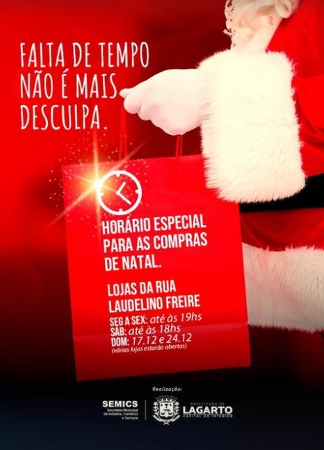 Com o objetivo de incentivar as tradicionais compras natalinas, as lojas que integram a Rua Laudelino Freire, no centro de Lagarto, funcionarão em horário especial neste fim de ano. A informação foi confirmada pela Prefeitura do Município.