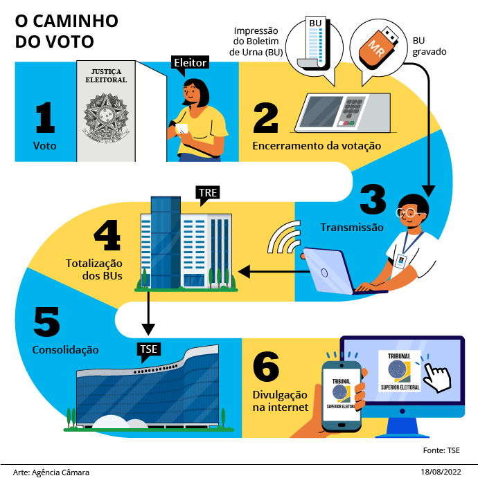 Veja abaixo como é o processamento do voto eletrônico, desde a seção eleitoral até a divulgação dos resultados pelo Tribunal Superior Eleitoral (TSE).