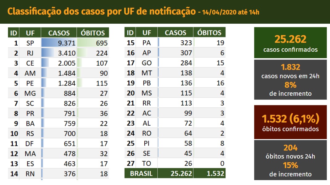 O número de mortes decorrentes do novo coronavírus (covid-19) subiu para 1.532 no país e o de casos, para 25.262. A nova totalização foi divulgada pelo Ministério da Saúde, que, durante entrevista coletiva no Palácio do Planalto, apresentou pela primeira vez dados sobre o número de pessoas curadas. Partindo de estimativas adotadas em outros países, representantes da pasta afirmaram que o índice é de 55% dos casos confirmados, o que significaria um total de 14.026 pessoas.