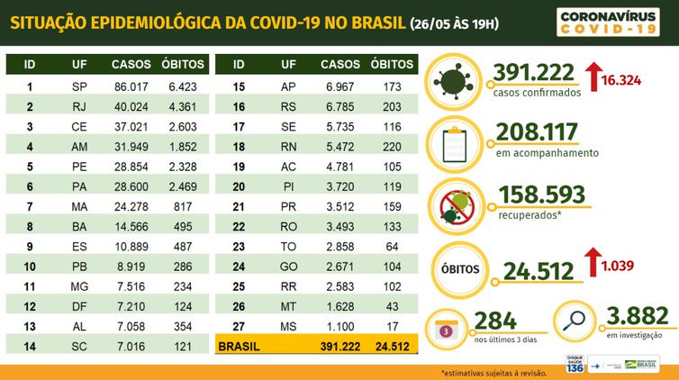 O Brasil registrou 1.039 novas mortes por covid-19, chegando ao total de 24.512. O resultado representou um aumento de 4,4% em relação a última segunda-feira, 25, quando foram contabilizados 23.473 óbitos provocados pela doença. Os números foram divulgados no balanço do Ministério da Saúde divulgado na última terça-feira, 26.