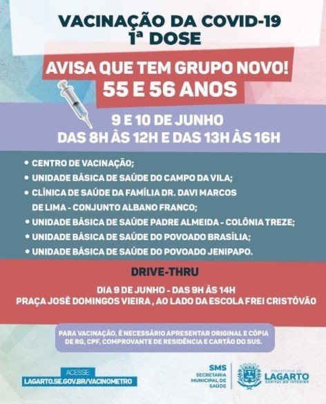 Entre os dias 09 e 10 de junho, os cidadãos com idades entre 55 e 56 anos poderão requerer a 1ª dose da vacina contra o novo coronavírus (covid-19) em Lagarto. A ampliação foi informada na noite de ontem, 08, pela prefeitura municipal.