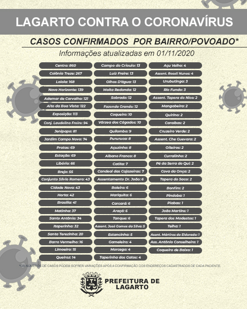 Informações da Secretaria Municipal de Saúde (SMS) de Lagarto indicam que, no último domingo, 1º, o município não registrou nenhum caso do novo coronavírus (COVID-19). Com isso, Lagarto permanece com 2.880 casos confirmados da doença desde o início da pandemia.