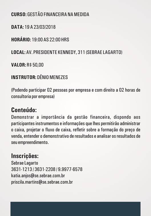 O Sebrae em Lagarto estará realizando entre os dias 19 à 23, um curso de Gestão Financeira.