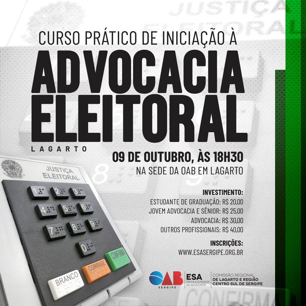 Na próxima quarta-feira (9), a Ordem dos Advogados do Brasil – Regional Lagarto realizará o curso intitulado “Prática de iniciação à Advocacia Eleitoral”. A ação, que será realizada na sede da OAB Lagarto, iniciará às 18h30 e encerrará às 21h30.