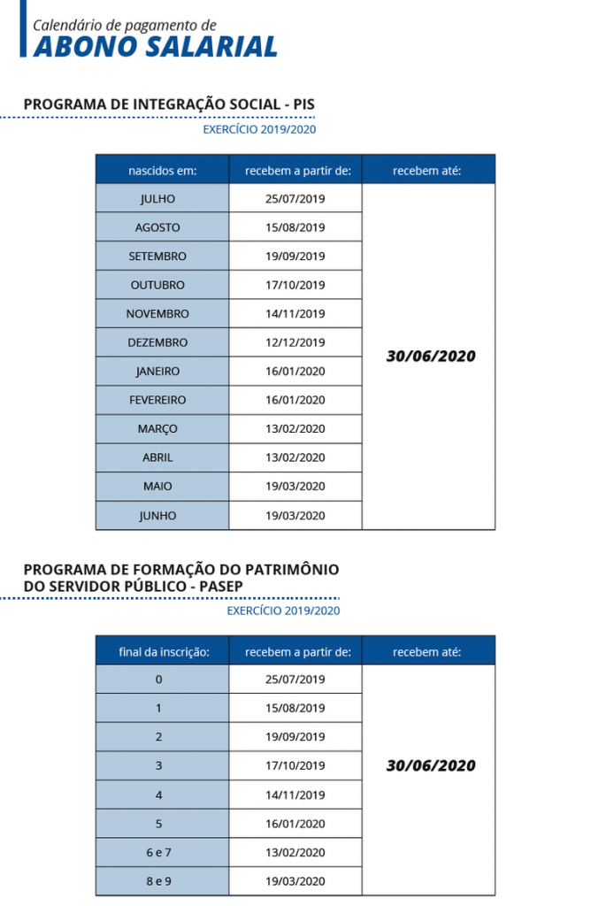 O calendário de pagamento do Abono Salarial 2019/2020 foi definido pelo Conselho Deliberativo do Fundo de Amparo ao Trabalhador (Codefat). A resolução com a medida está publicada no Diário Oficial da União desta quarta-feira (10). De acordo com o documento, o pagamento será realizado a partir de 25 de julho próximo até 30 de junho de 2020.
