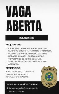 A Delegacia Regional de Lagarto anunciou que está com vaga aberta para estagiário(a) de Direito.