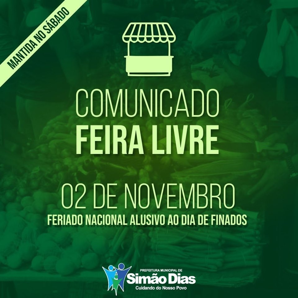 A Prefeitura de Simão Dias informa que não haverá antecipação da Feira Livre do sábado, 2 de novembro, Feriado Nacional alusivo ao Dia de Finados.