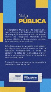 A prefeitura de Lagarto, através da Secretaria Municipal do Desenvolvimento Social e do Trabalho (SEDEST), informou que durante as inscrições para o Programa Morando Bem, alguns objetos e documentos pessoais foram encontrados no local.
