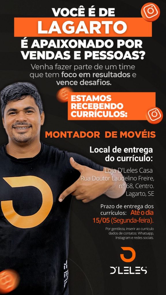 A D’Leles Casa está com vaga de trabalho aberta para montador de móveis em Lagarto. Os currículos devem ser entregues até a próxima segunda-feira, 15, na sede da referida loja, situada na Rua Doutor Laudelino Freire, 68, no centro comercial da cidade.