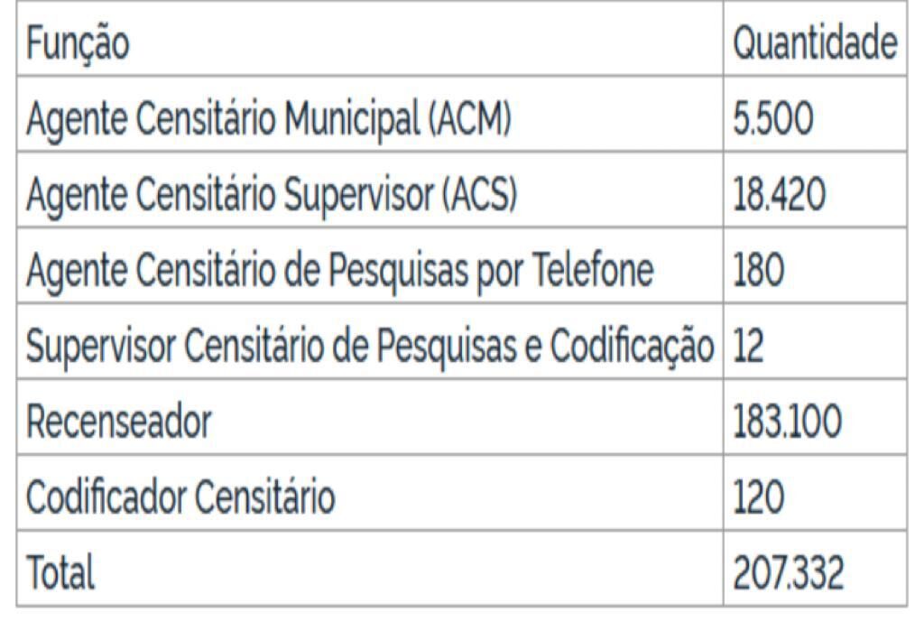 No total, são 207.332 vagas temporárias para diversos cargos, como Recenseador, Agente Censitário Municipal e Agente Censitário Supervisor. As vagas são para nível fundamental e superior, com salários bases que variam de R$ 1.100 a R$ 2.100.