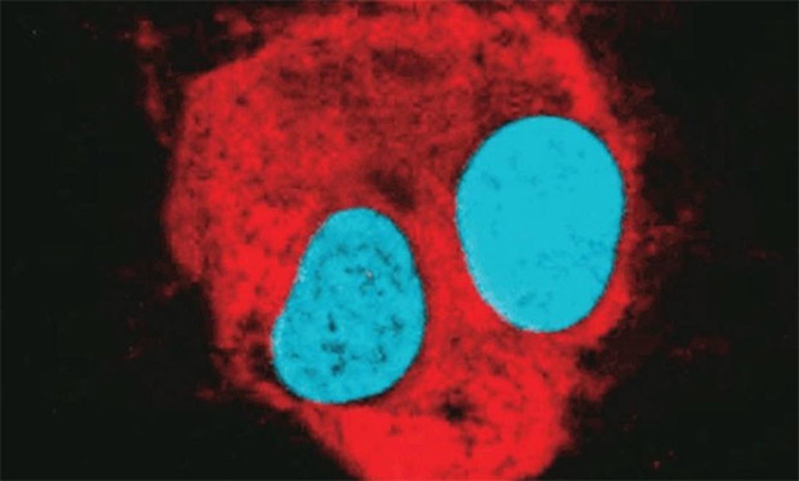 Primeira imagem do mundo do vírus zika (em azul) atacando neurônios humanos. Agora, estudo preliminar mostra que neurotransmissor glutamato está envolvido em mecanismo de infecção