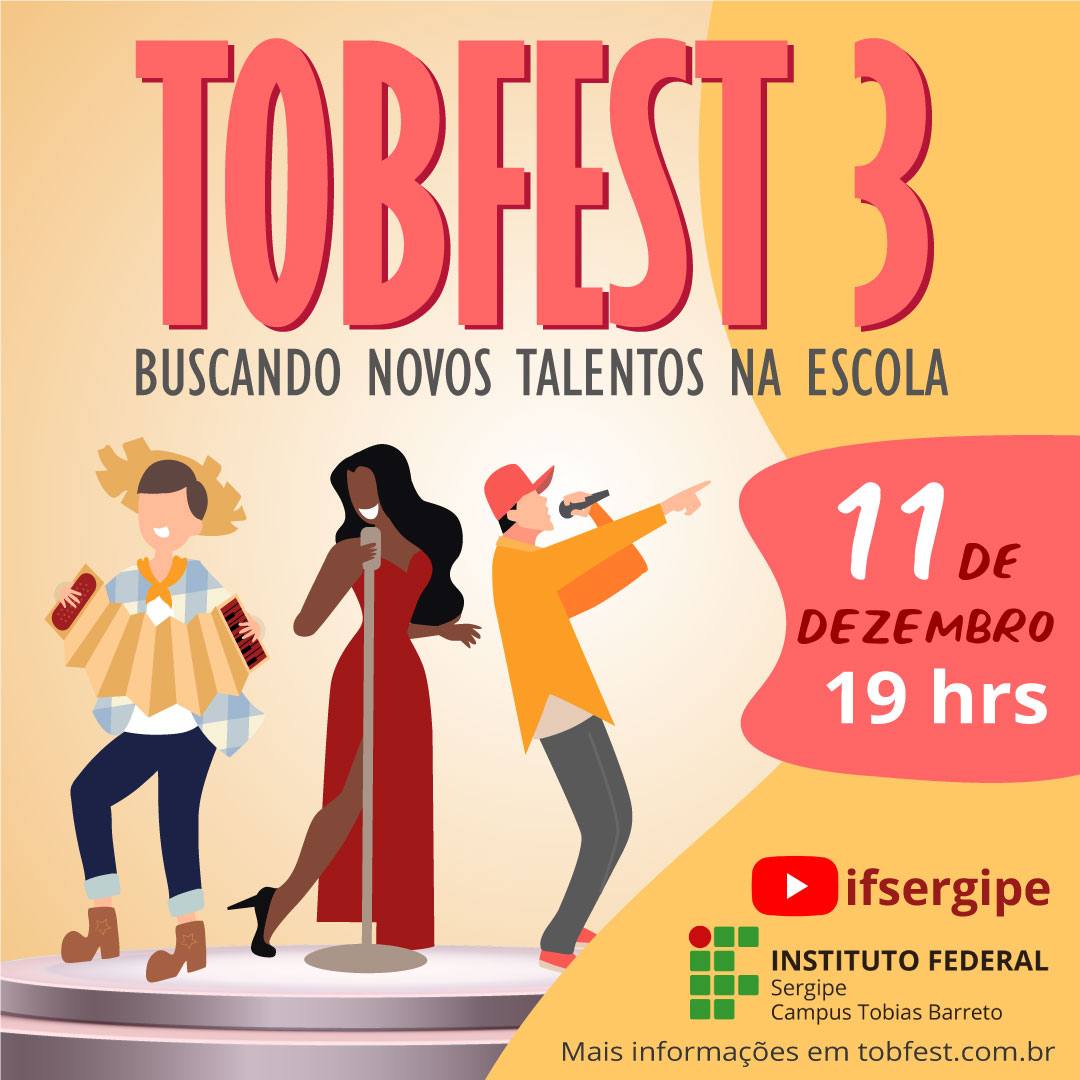 Dar visibilidade aos talentos dos estudantes de Tobias Barreto é a proposta do TobFest, o festival de talentos estudantil organizado pelo Campus Tobias Barreto do Instituto Federal de Sergipe (IFS), que este ano realiza sua terceira edição. O festival, que costuma reunir uma plateia diversa em uma das praças principais da cidade, em 2020 precisou ser readequado por conta da pandemia do novo Coronavírus e será transmitido numa live no canal oficial do IFS no Youtube, dia 11 de dezembro, a partir das 19h.