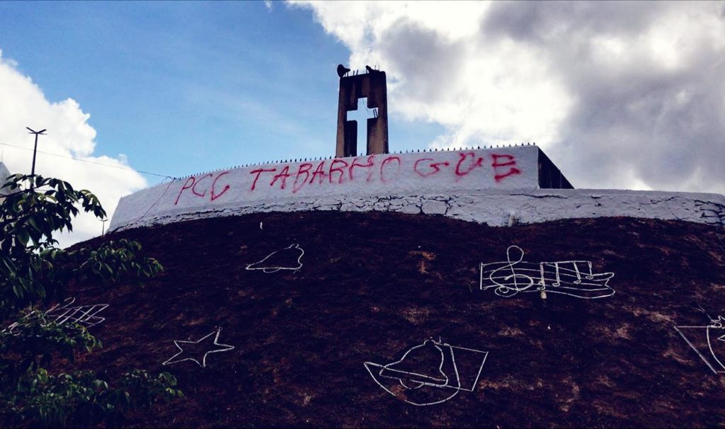 Essa é a segunda vez que a menção a facção criminosa é encontrada na praça da comunidade. Na primeira vez a pichação havia sido feita na estátua de Santa Luzia.