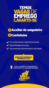 A maior Salgateria de Sergipe, a Jet Salgados, anunciou que está com vagas de emprego para os cargos de Auxiliar de Salgadeira e Confeitaria.