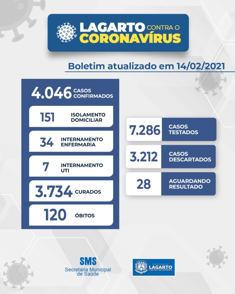 Já o número de lagartenses internados é de 41, sendo que 34 estão internados em leitos de enfermaria e sete na UTI.