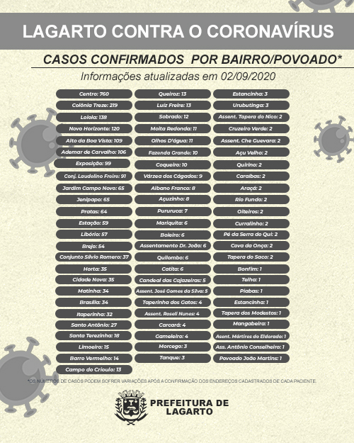 A Secretaria Municipal de Saúde (SMS) divulgou nesta quarta-feira, 2, o novo boletim epidemiológico em que registra mais 19 casos do novo coronavírus, totalizando 2.514 lagartenses que já testaram positivo para a covid-19.