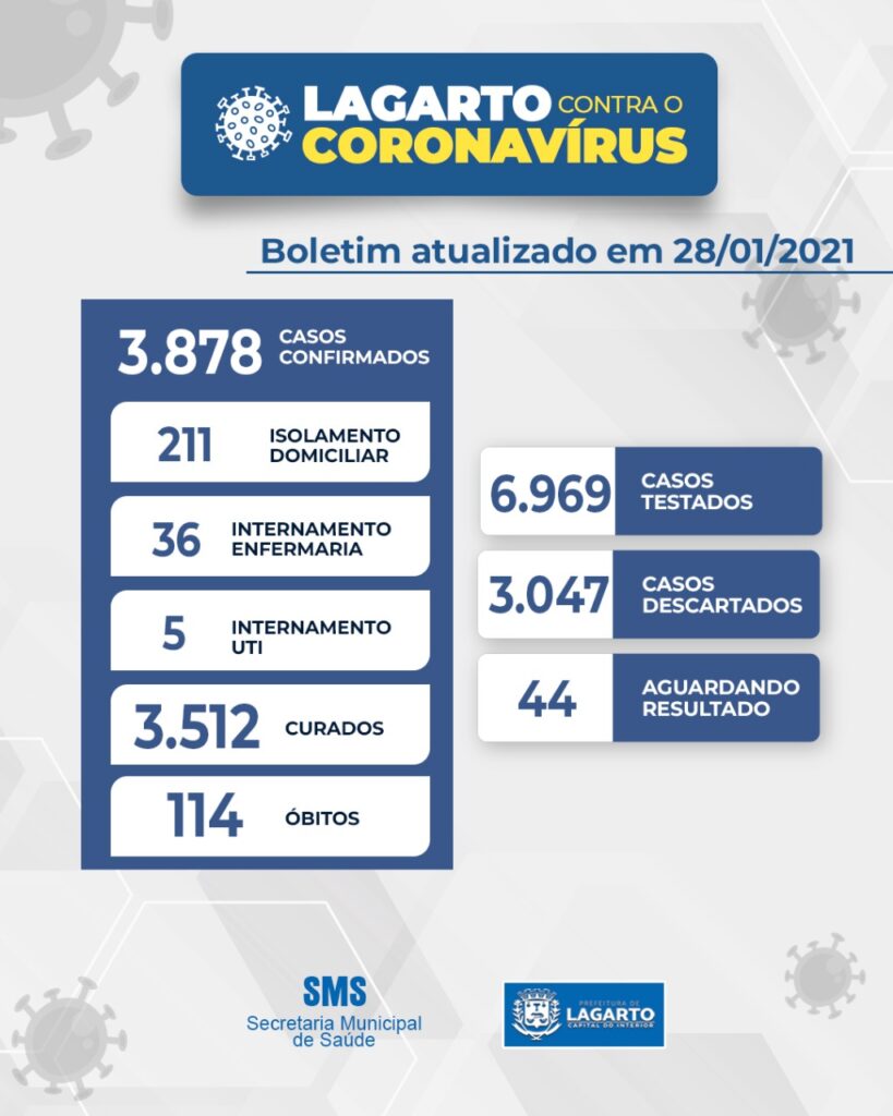 Informações da Secretaria Municipal de Saúde (SMS) de Lagarto indicam que, na última quinta-feira, 28, o município registrou quatro novos casos de COVID-19. Com isso, Lagarto passa a ter 3.878 casos confirmados da doença desde o início da pandemia.