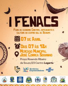 Em parceria com a Agência de Desenvolvimento do Centro-Sul (Desenvolve Centro-Sul), a Prefeitura de Lagarto realiza na próxima segunda-feira, 07, a 1ª Feira de Economia Criativa, Artesanato e Cultura da região (Fenacs). Durante o evento, que reúne os oitos municípios do território, haverá exposição de artesanatos, apresentações culturais e comercialização de pratos típicos específicos de cada cidade. A Fenacs acontece das 7h às 12h, com entrada gratuita, no Mercado Municipal José Corrêa Sobrinho, localizado na Praça Rosendo Ribeiro de Souza, em Lagarto.