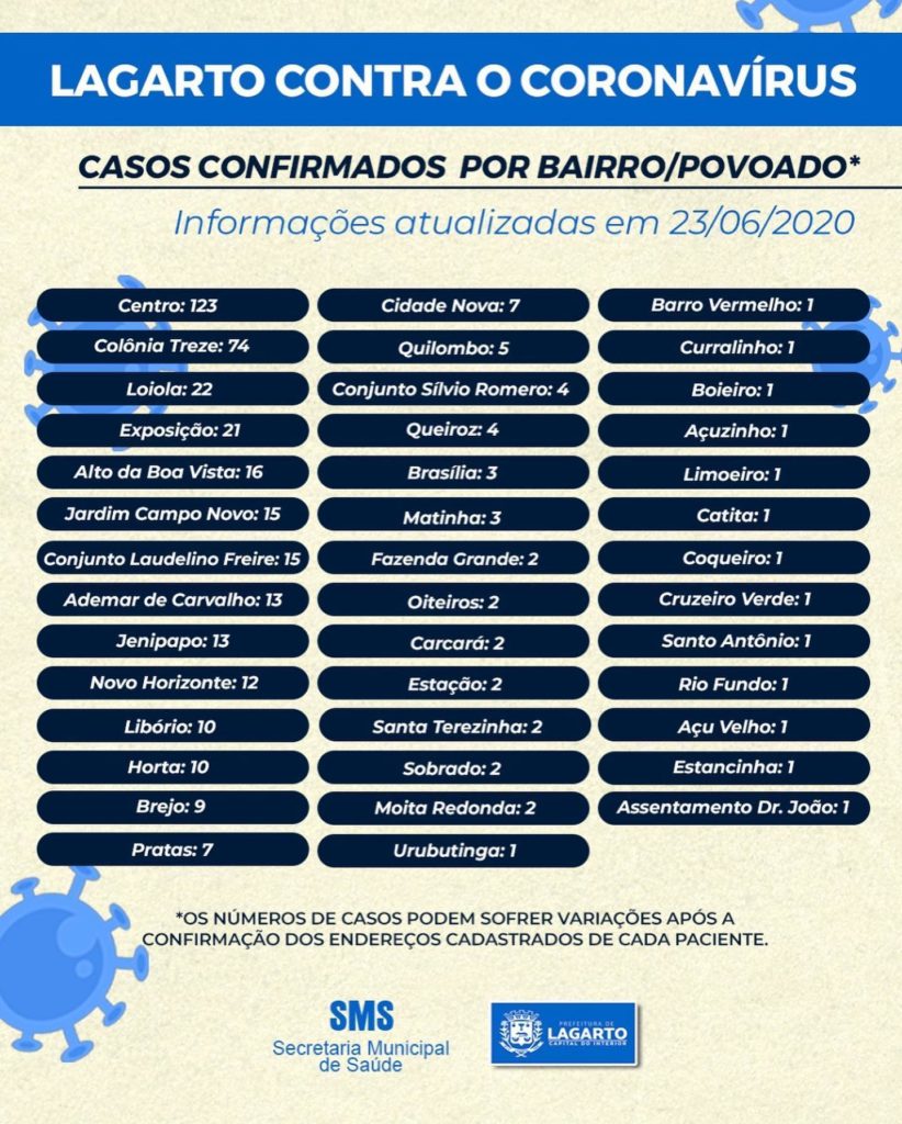 A Secretaria Municipal de Saúde (SMS) de Lagarto registrou nesta terça-feira, 23, mais 21 casos de covid-19. Com isso, o município passa a ter 414 pessoas que já foram infectadas pelo novo coronavírus.