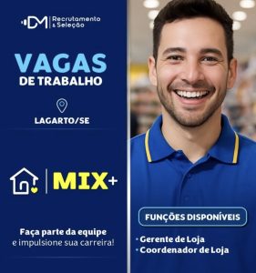 A loja MIX+ em Lagarto anunciou que está com vagas de emprego disponíveis para os cargo de Gerente de Loja e Coordenador de Loja.