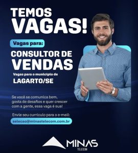A Minas Telecom anunciou que está com uma vaga de emprego para o cargo de Consultor de Vendas, em Lagarto.