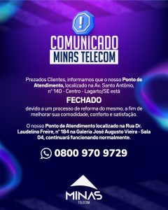 A Minas Telecom divulgou um nota informando que o Ponto de Atendimento que fica localizado na Avenida Santo Antônio, nº 140, no Centro de Lagarto, está fechado, temporariamente.