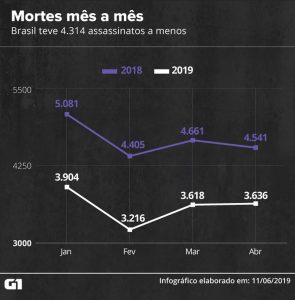 O número de assassinatos, porém, continua alto. Nos primeiros quatro meses de 2019, uma pessoa foi assassinada a cada 12 minutos no país.