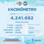 Foram enviadas aos municípios 4.709.348 doses. Destas, 1.901.533 foram aplicadas como primeira dose; 1.620.634 como segunda dose; 40.125 como dose única e 679.390 como dose de reforço. A cobertura vacinal de primeira dose está em 83,73% e 71,62% estão com a imunização completa.