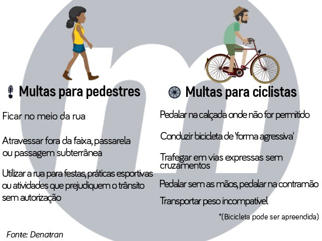 Da mesma forma, ciclistas que trafegarem em vias expressas, na contramão, sem as mãos ou carregando peso incompatível com a bicicleta, deverão arcar multa de R$ 130,16, com possibilidade de apreensão da bicicleta, caso sejam pegos pela fiscalização.
