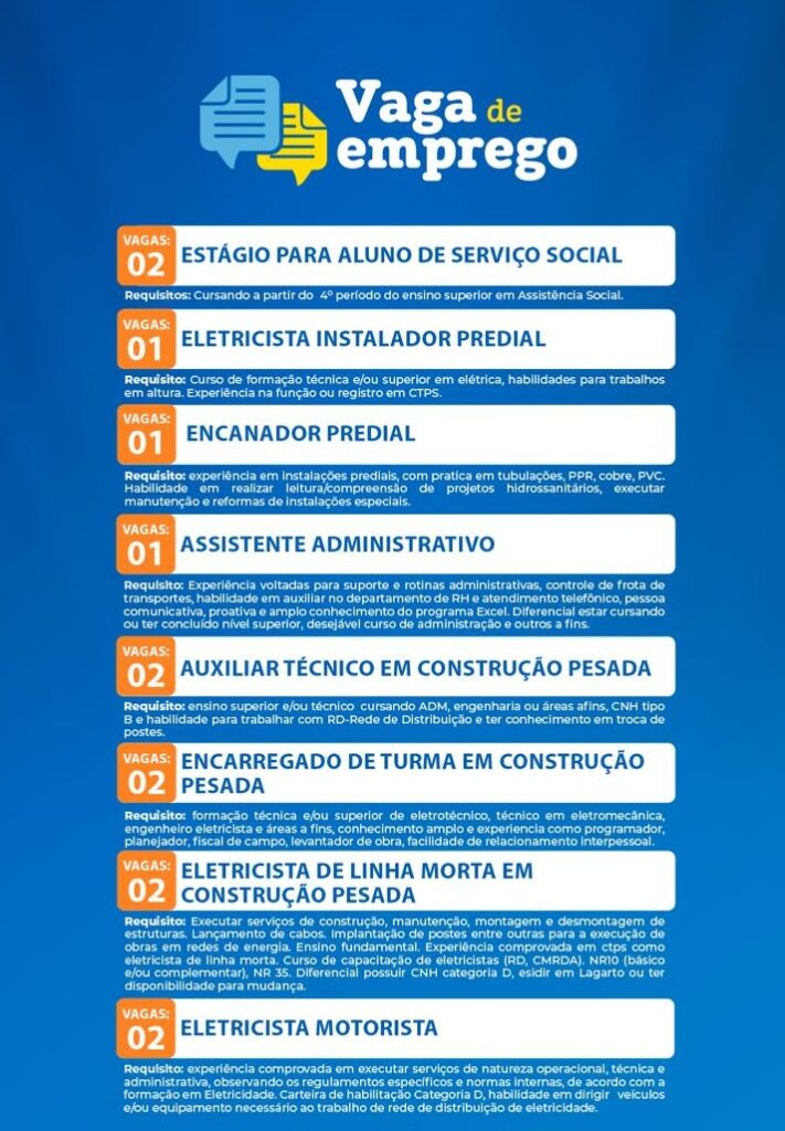 O Núcleo de Apoio ao Trabalho (NAT) está disponibilizando 24 vagas de trabalho em Lagarto. As oportunidades são para todos os níveis de escolaridade e, em alguns casos, é requerida experiência prévia.