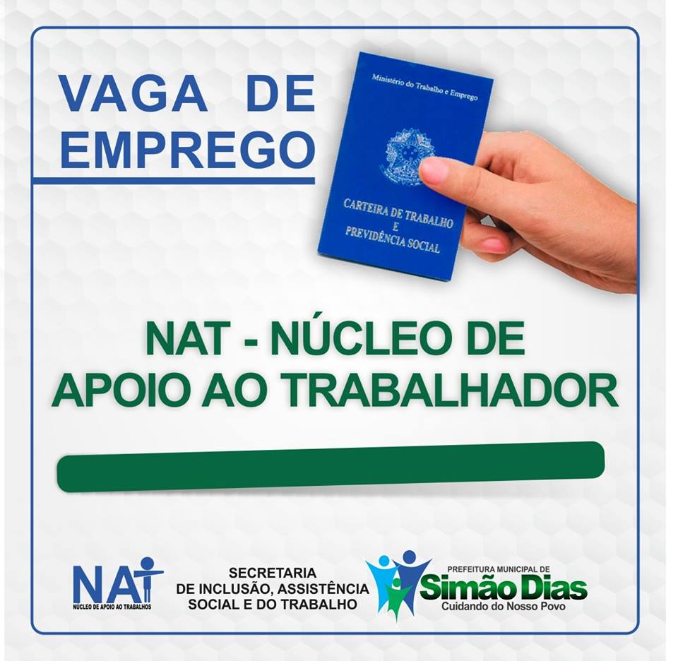 A Secretaria de Inclusão Social, Assistência Social e do Trabalho, através do Núcleo de Apoio ao Trabalho (NAT) disponibiliza vaga de emprego em Simão Dias.