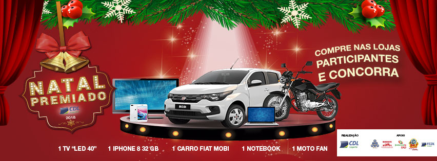 A CDL ( Câmara de Dirigentes Logistas de Lagarto), está sorteando vários prêmios, aos clientes que fizerem as suas compras nas lojas do comércio local,tem um carro FIAT MOBI 0km, uma TV Led de 40 polegadas, um Iphone 8 de 32GB, 1 moto FAN e um Notebook.