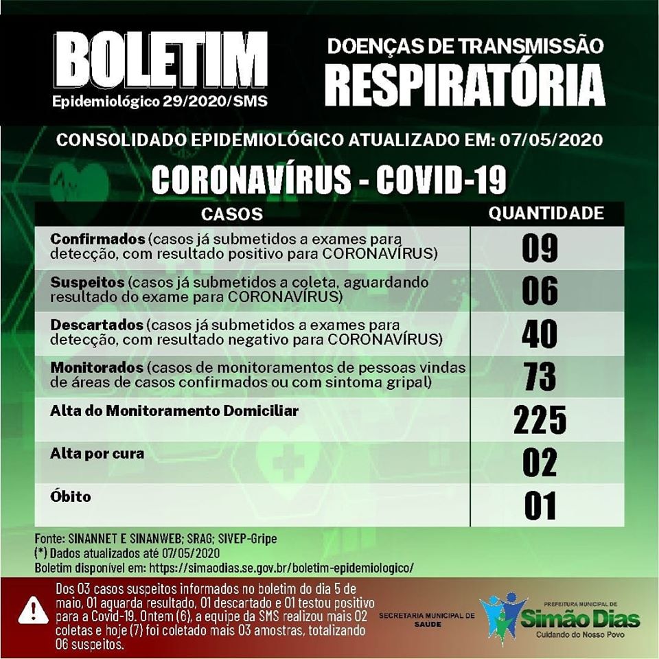 Ainda segundo o boletim, a Secretaria Municipal de Saúde de Simão Dias está aguardando o resultado da análise de seis casos suspeitos, cujas amostras foram coletadas entre os dias 05 e 06 de maio. Entretanto, felizmente, o 40º caso suspeito da doença foi descartado no município.