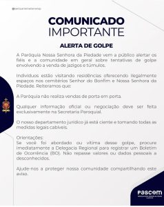 “A Paróquia não realiza vendas de porta em porta. Qualquer informação oficial ou negociação deve ser feita exclusivamente na Secretaria Paroquial” informou a entidade religiosa.