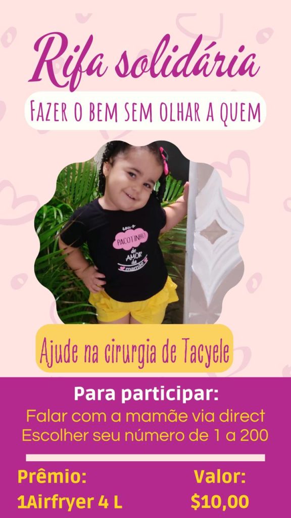 Uma campanha solidária foi lançada para ajudar na cirurgia da pequena Tacyele. Para arrecadar fundos, a família organizou uma rifa onde o prêmio é uma airfryer de 4 litros. Com apenas R$ 10,00, você pode escolher um número entre 1 e 200 e ter a chance de ganhar o prêmio enquanto contribui para uma causa nobre.