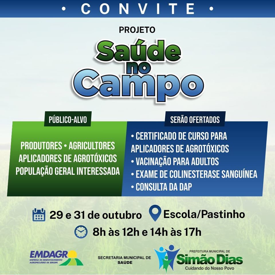 A Secretaria Municipal de Saúde de Simão Dias, em parceria com a Empresa de Desenvolvimento Agropecuário de Sergipe (Emdagro), convida todos os agricultores e aplicadores de agrotóxicos da região do Pastinho para participar do ‘Projeto Saúde no Campo’.