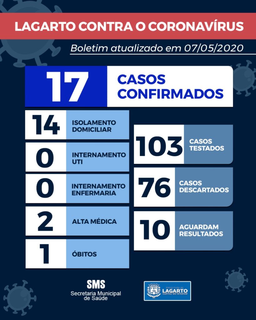 Atualmente, Lagarto possui 17 casos confirmados, 10 aguardando o resultado dos exames, 1 óbito e 02 curados. O dado consta no Boletim Epidemiológico divulgado pela Secretaria Municipal de Saúde na última quinta-feira, 07.