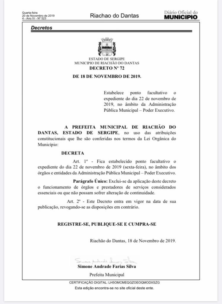 Em decorrência do feriado alusivo a Nossa Senhora do Amparo, excelsa padroeira de Riachão do Dantas, a prefeita Simone Andrade decretou ponto-facultativo em toda a administração municipal, na próxima sexta-feira, 22.
