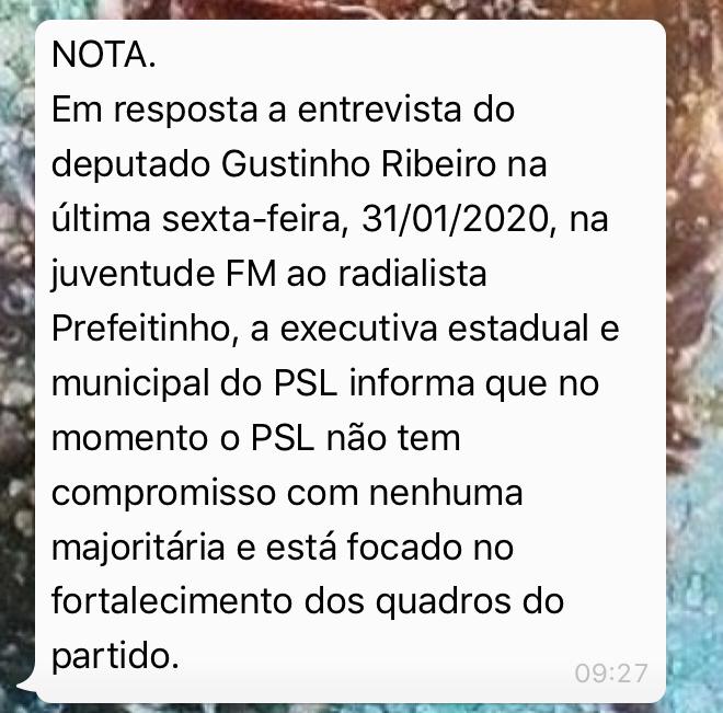 A breve nota do PSL foi divulgada a pedido do presidente do Diretório Municipal do partido em Lagarto, Michel Rodrigues. No entanto, cabe destacar que, embora a nota não aborde o assunto, a forma como Gustinho mencionou o PSL durante a entrevista, deu a entender que de alguma maneira o referido partido ficaria sob o seu comando.