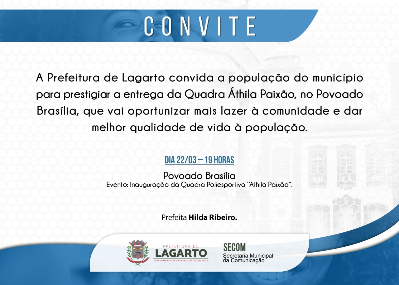 A Prefeitura de Lagarto convida a população do município para prestigiar a solenidade de entrega da Quadra Áthila Paixão, no Povoado Brasília, que vai oportunizar mais lazer á comunidade e dar melhor qualidade de vida á população.