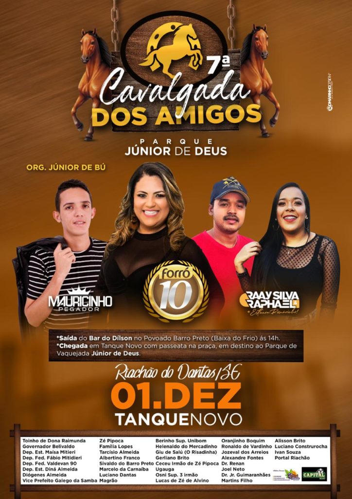 O povoado Tanque Novo, em Riachão do Dantas, será palco da 7ª edição da Cavalgada dos Amigos do Parque Júnior de Deus, que acontece no dia 1° de dezembro. O evento contará com apresentações de Mauricinho Pegador, Forró 10 e Raay Silva e Raphael.
